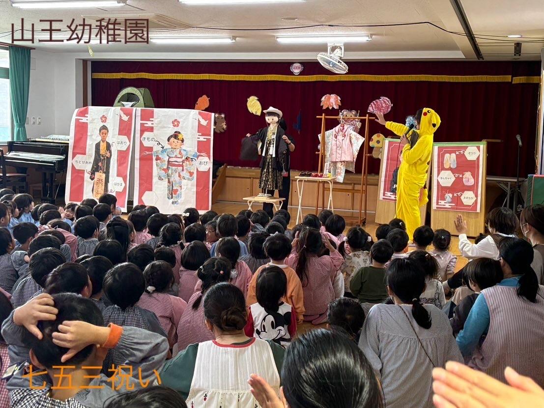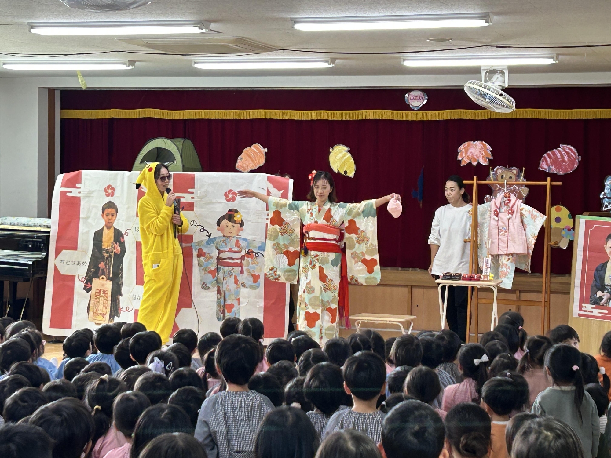 「劇団ふくろう」のお母さん達の出し物では、七五三のお着物や身につけるものなどをクイズ形式で楽しい雰囲気の中、子どもたちも楽しそうに答える姿が見られました。